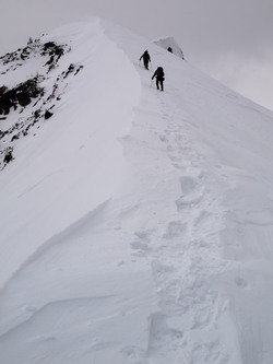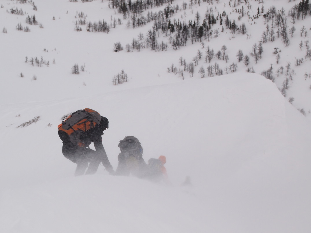 The people descending ahead of me, partially obscured by blowing snow. There is probably only a breeze in the larch forest visible in the basin below.
