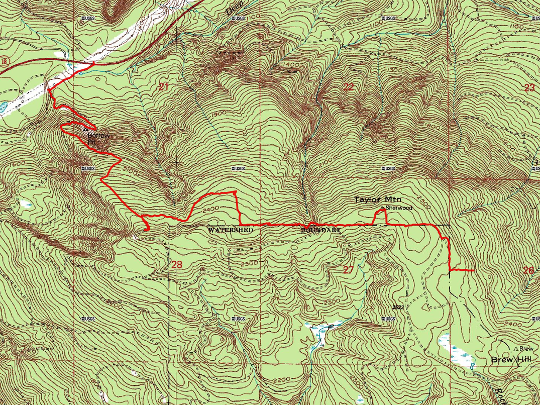 I continued SE toward Brew Hill, skirting the watershed boundary. Unfortunately, I discovered that the boundary has expanded eastward since my map was made and has completely engulfed Brew Hill. I followed the new boundary east for a while, eventually it became very brushy and I gave up.