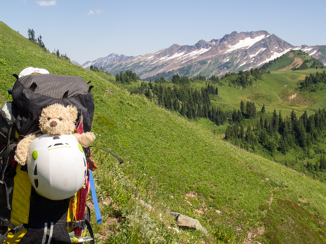 Descending the SW sub-ridge of Indian Head. Kodak Peak and Johnson Mountain in the background.